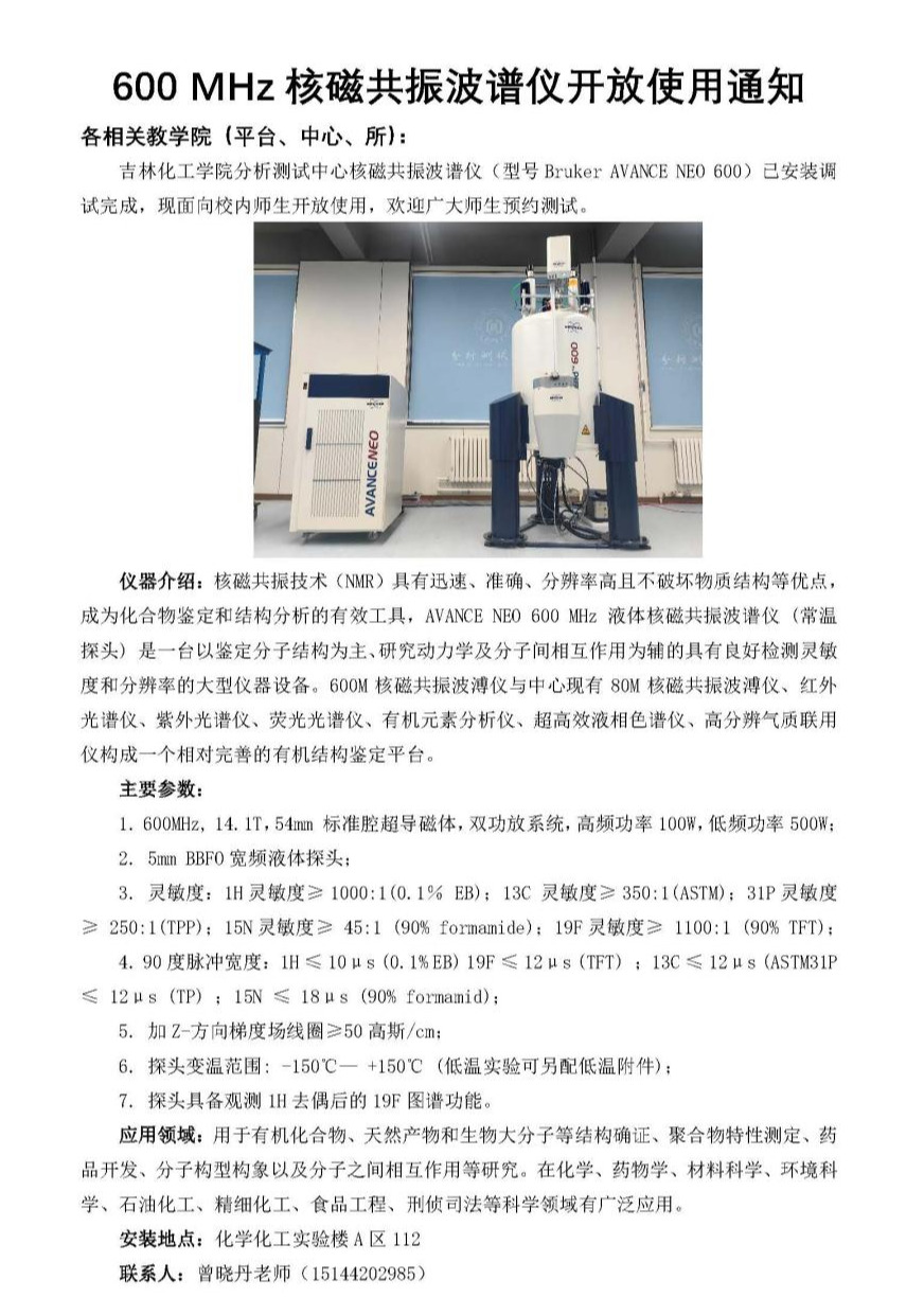 600 MHz核磁共振波谱仪开放使用通知